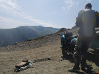 Sobald wir anfangen etwas Höhe zu gewinnen, fangen die Dnepr an sich zu quälen und werden heiß. So gibt es ein paar Pausen, nach Möglichkeit an Ecken wo man uns sieht und wir etwas Schatten haben. Wir treffen zwei tschechische Jungs die mit ihren 125er Mopeten in die Mongolei wollen. Außerdem haben sie von diesem Pass gehört und wollen es versuchen. Wir entschließen uns zusammen zu fahren. So können wir uns gegenseitig helfen. Wir werden später feststellen wie weise diese Entscheidung war.